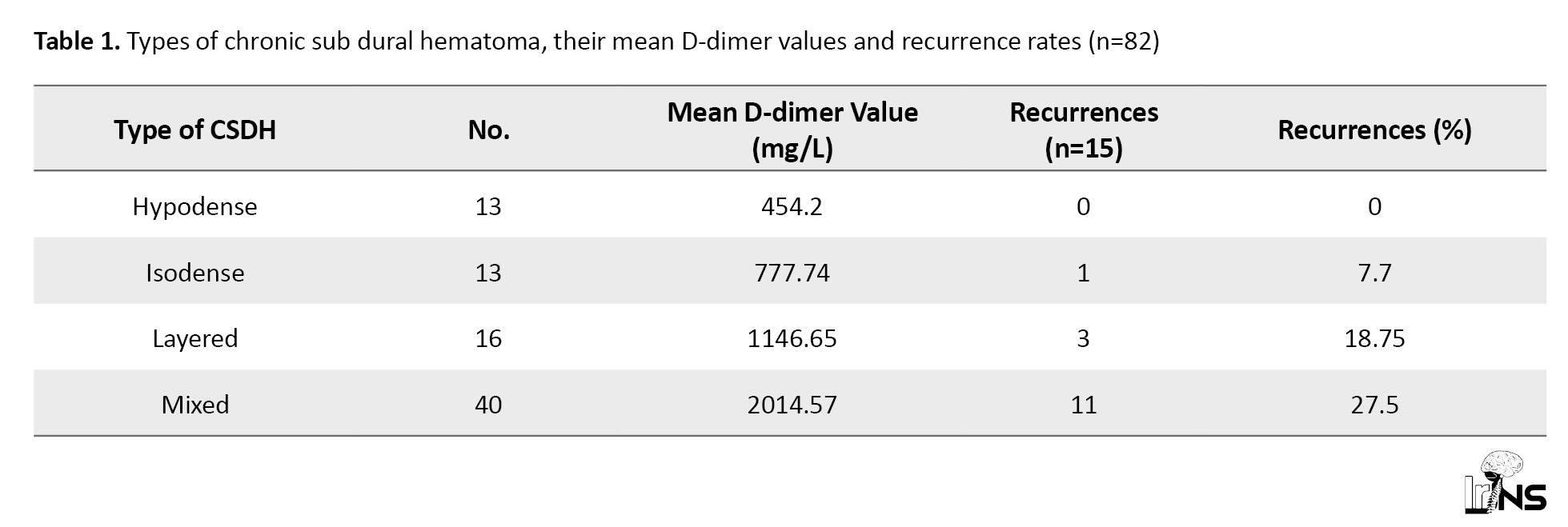 We noted a higher incidence of D-dimer values in patients with a heterogeneous group of CSDH, which includes the mixed and layering subtypes, compared to the homogenous group consisting of hypo- and isodense groups. Higher D-dimer values and heterogeneous appearance on scan correlated with recurrences, with maximum recurrence noted in the mixed group. Steroids may have a role in the prevention of recurrence in CSDH, although further studies are needed to elucidate their significance in that regard.