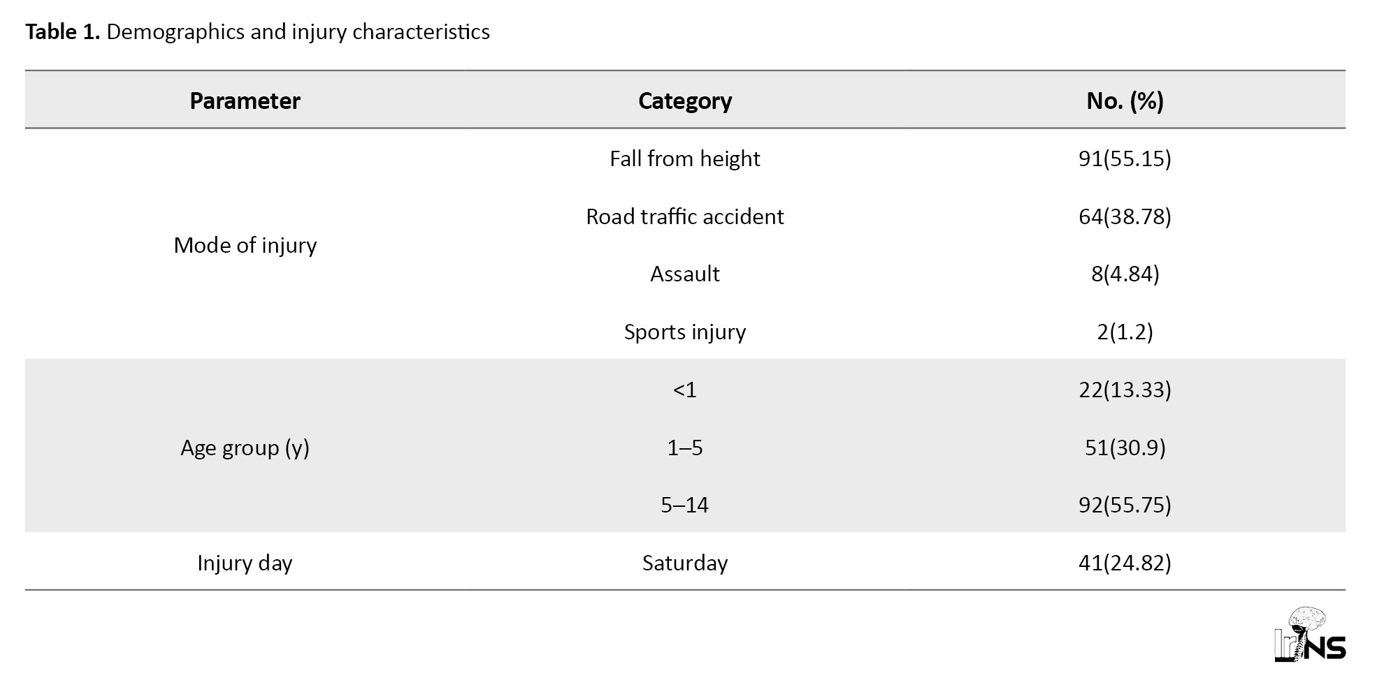A total of 165 TBI patients aged up to 14 years, with a Mean±SD age of 9.22±3.16 years. Among recruited study participants, 114(69.09%) patients were males, and 51(30.90%) patients were females, with a male‑to‑female ratio of 2.24:1.