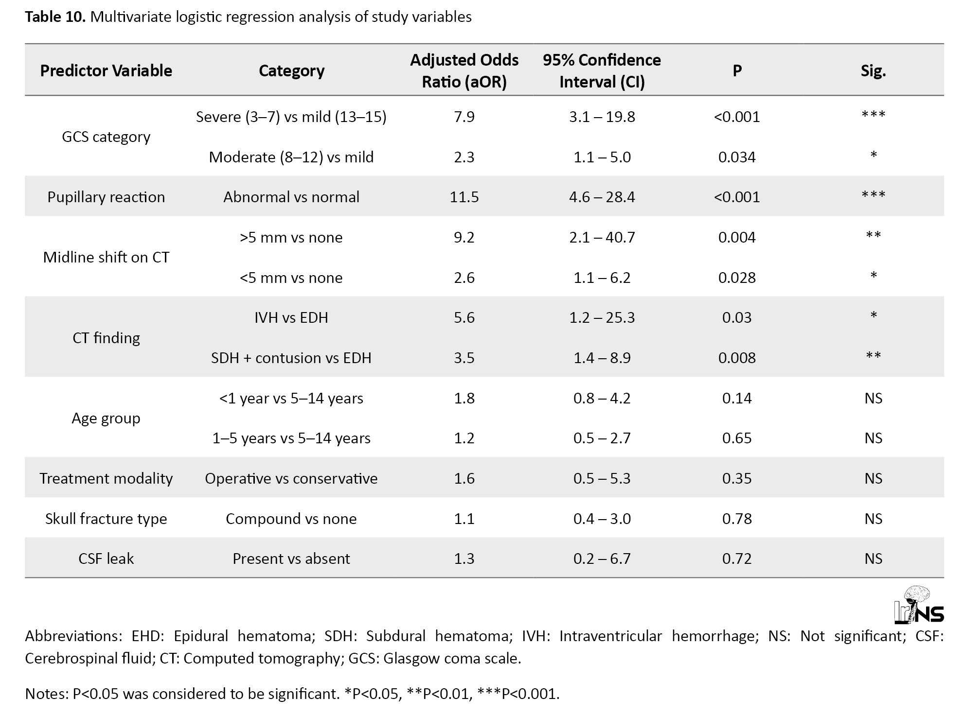 The outcome was evaluated using age, gender, GCS, pupil size and reaction, CT scan features, intervention, and associated injuries. Multivariate logistic regression analysis of study variables was performed to identify independent prognostic factors.
