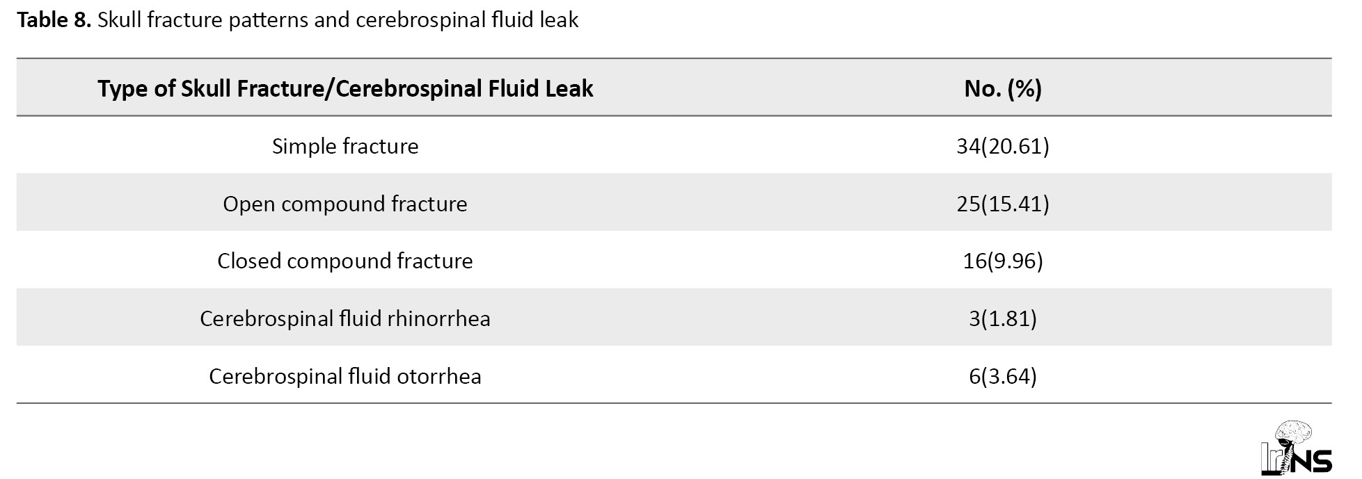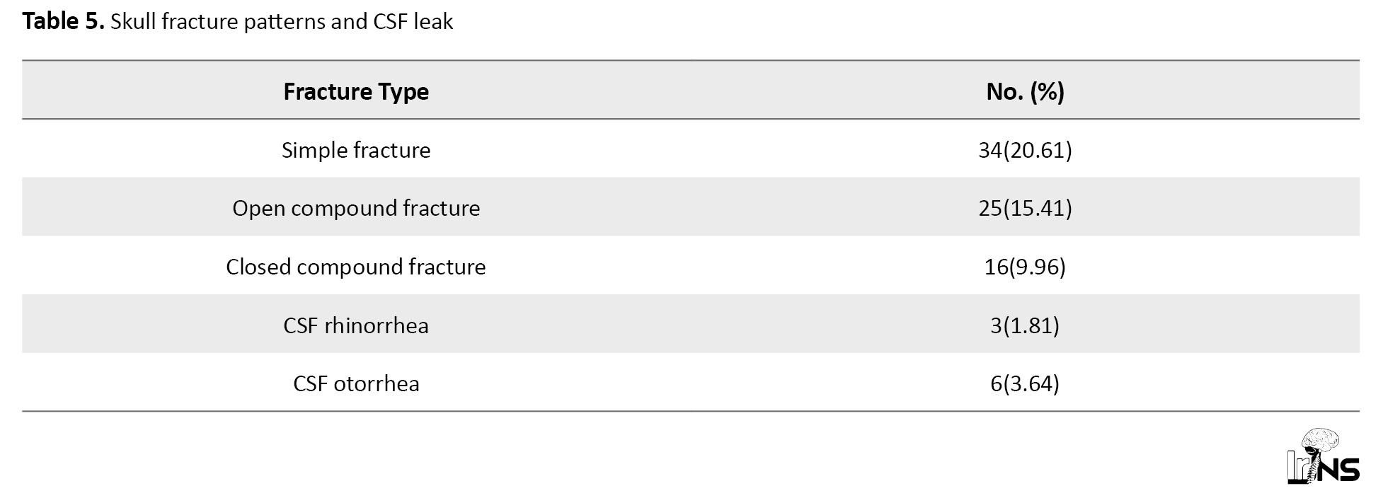 Table 4). The study identified 34 cases (20.61%) of simple skull fractures, 25 cases (15.41%) of open compound fractures, and 16 cases (9.96%) of closed compound fractures. CSF leaks were less common, with 3 cases (1.81%) of CSF rhinorrhea and 6 cases (3.64%) of CSF otorrhea. These findings highlight the prevalence of simple fractures as the most frequent skull fracture type, while CSF leaks were relatively rare complications (
