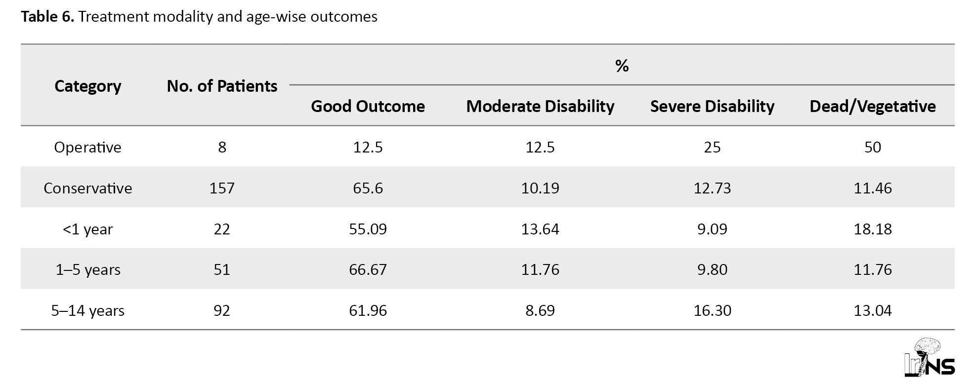 Operative treatment was administered to 8 patients, with 50% experiencing poor outcomes (dead/vegetative state), while conservative management was applied to 157 patients, yielding better results (65.6% good recovery). Age-wise analysis demonstrated the highest good recovery rates in the 1–5 years age group (66.67%), followed by the 5–14 years group (61.96%) and the <1 year group (55.09%). Severe disability and mortality were more prevalent in the operative group and the youngest age group (<1 year;
